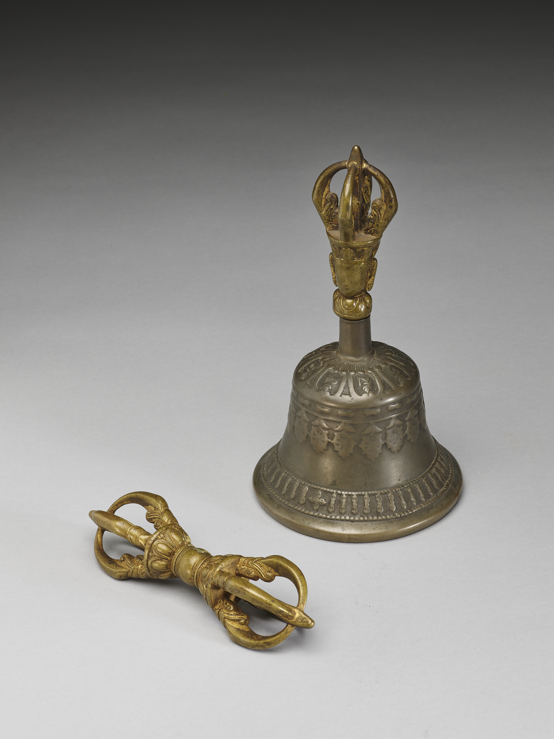古老的一對五股鈴杵(故雜573-574),鍍金剝蝕,露黃銅色,鈴首的佛像僅具其形,而五官不存;鈴身外壁的金剛杵、法輪、蓮瓣、梵字等,都已模糊而光滑。鈴內中央鑄陽紋寶相蓮花,花心以十字杵為穿鐸處;內壁並鑄一行正體梵字:「唵阿吽」,字緣線條模糊,但字形沈穩。兩器共置於一描漆皮盒內。附皮盒,內墨書漢、滿、蒙、藏文:「班臣厄爾德尼恭進鈴杵」。(NPM)