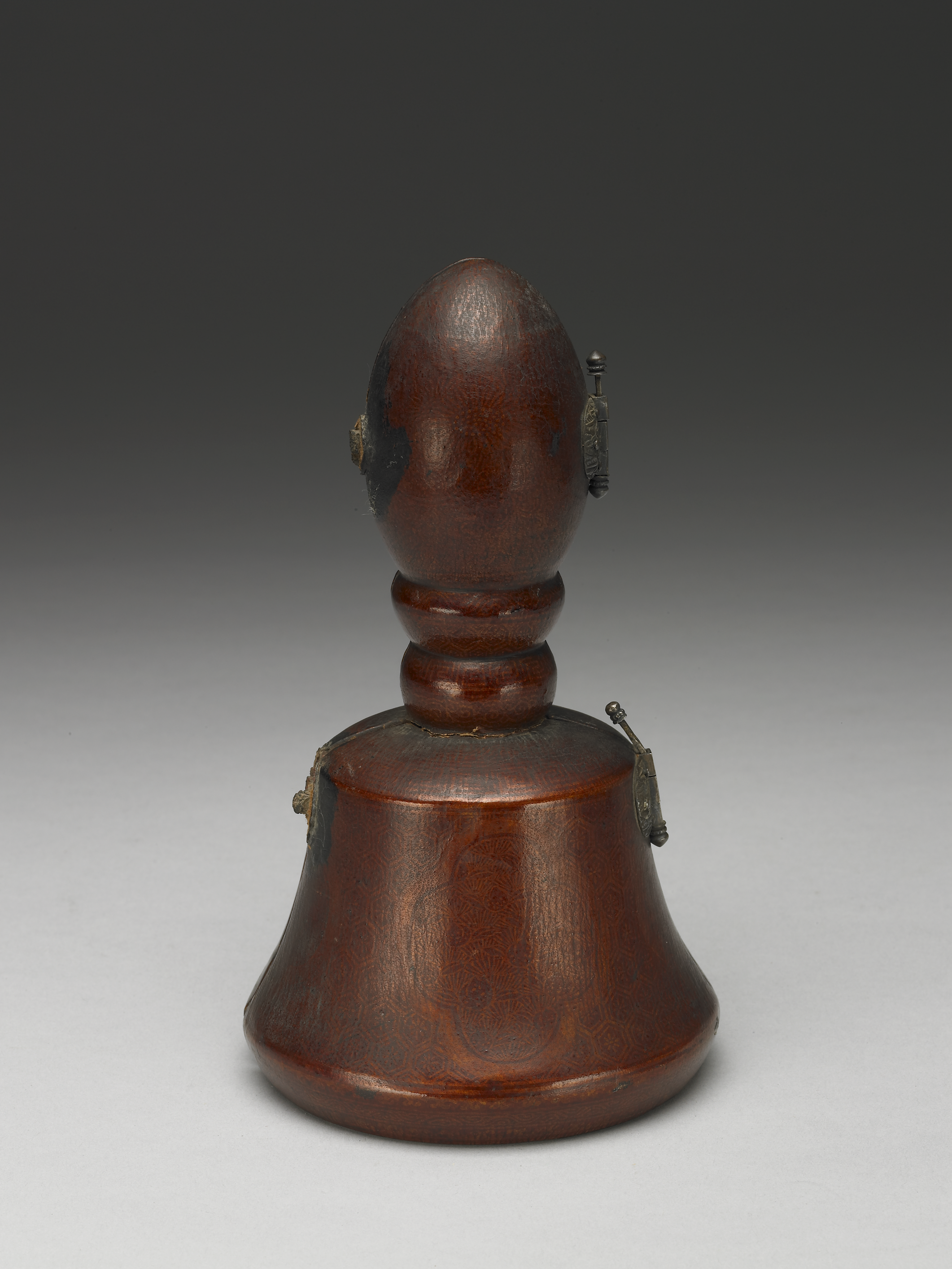 皮盒,盒隨器形。漆色黯褐,盒壁滿繪龜甲文錦地,柄轉折處有帶狀的回紋、渦捲紋。 鈴身的位置有四海棠形開光,內繪花葉紋,側邊為插銷,可開啟使盒左右打開,內襯紅色花綾裡。內附白綢墨書漢、滿、蒙、藏文:「班臣厄爾德尼恭進鈴杵」。與杵盒連接處斷裂。(NPM)