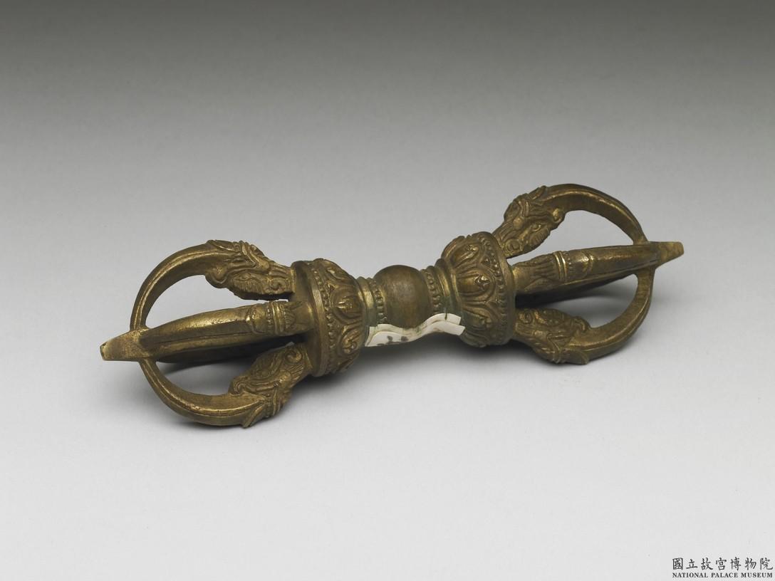 金剛杵。兩端首作五股式,摩羯首銜之,托以蓮瓣。手執處光素。附皮盒,與另件銅鈴共成一套。密宗佛教中,金剛杵為諸尊之持物或修法的道具,能破除魔障。五股杵代表五智五佛。(NPM)