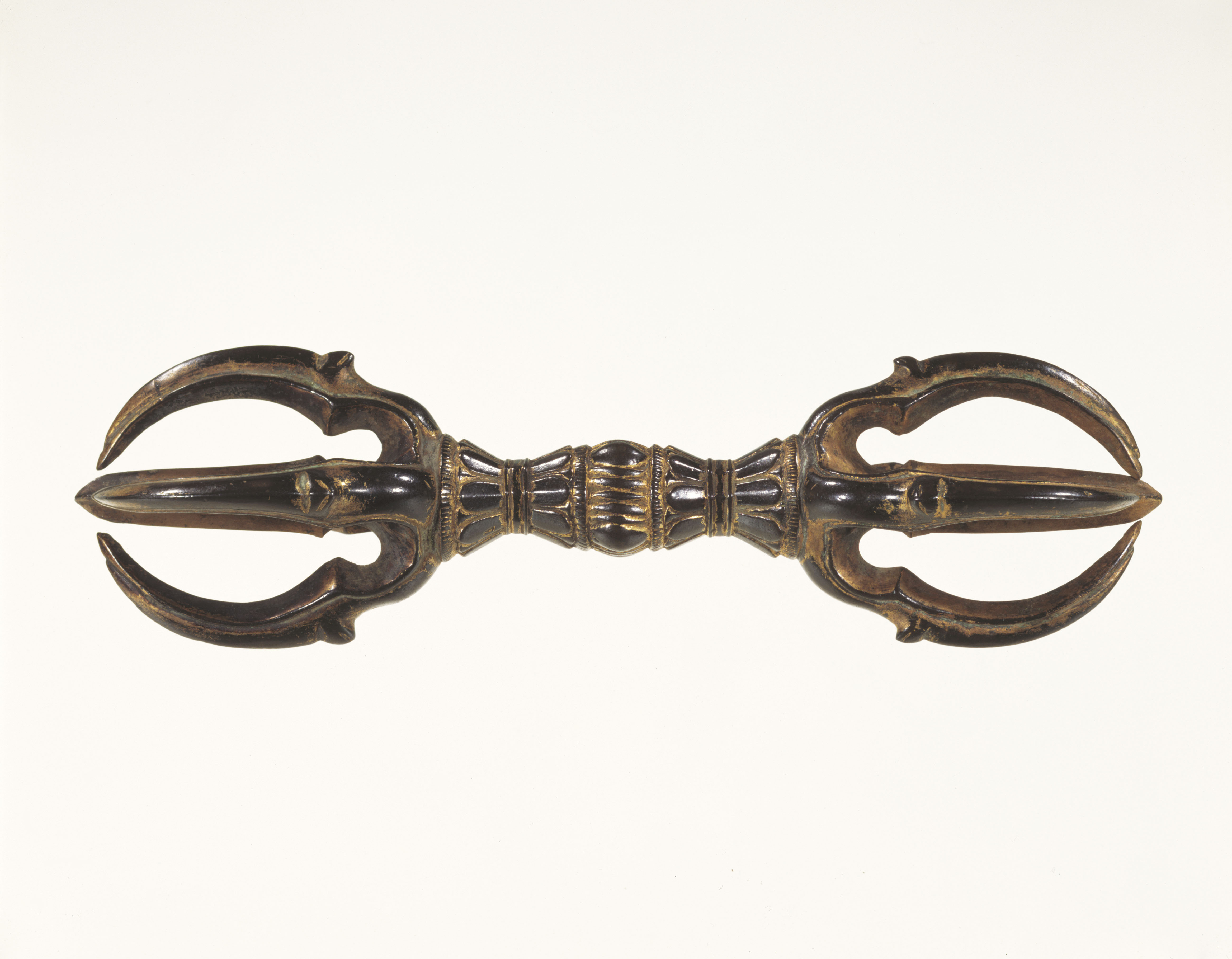 - 該作品是兩端各有五根鈷的金剛杵。鈷的弧線舒展,把手厚實有分量感。整體外形勻稱,鑄造精美。鈷把中央的鬼眼呈細長橢圓形,這種表現手法很少見。(NNM:三本週作撰,張小娟譯)