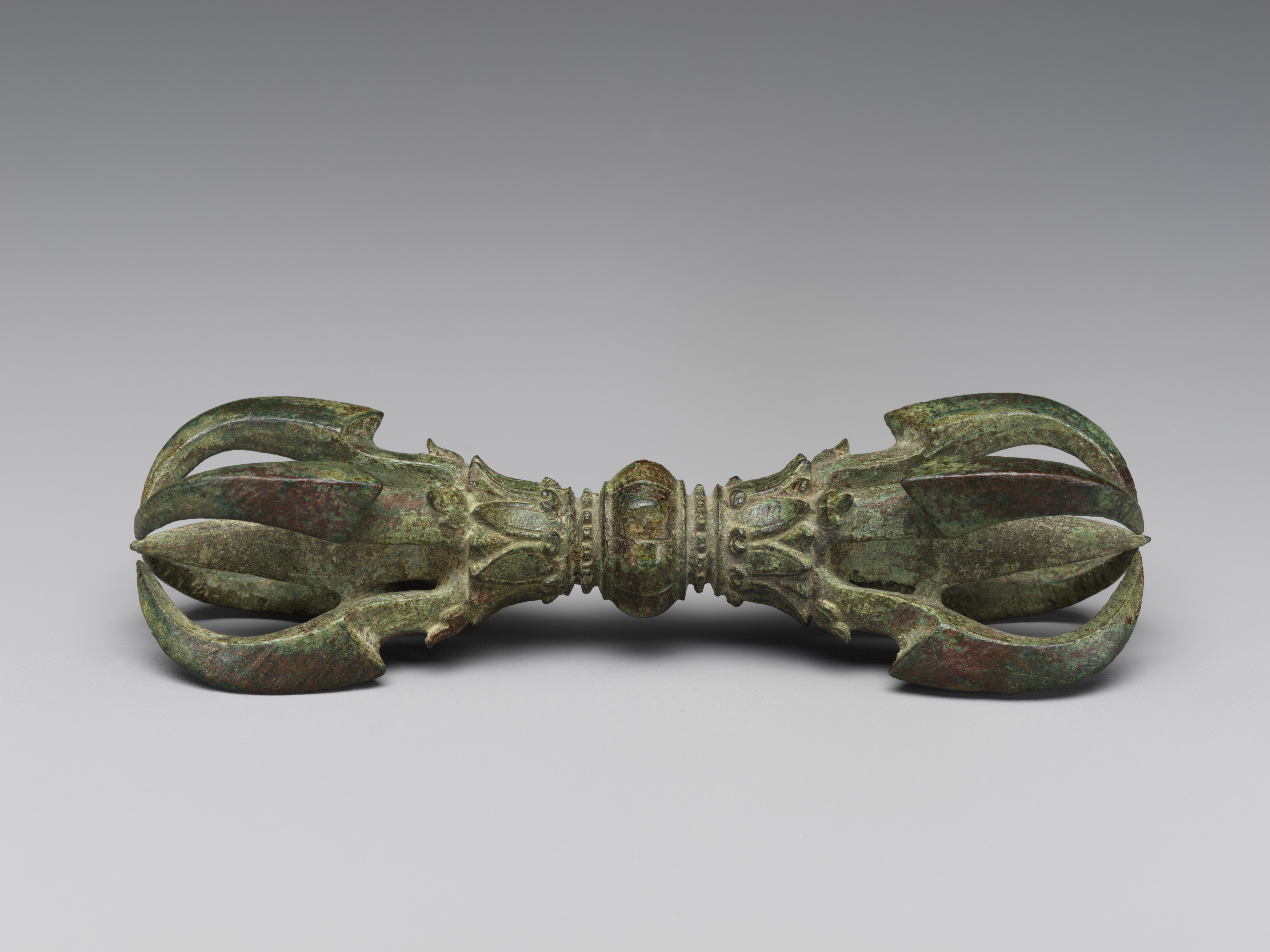 象徵與覺悟相關的能量,金剛杵常被描述為一道閃電,具有如鑽石般堅不可摧且光輝燦爛的特質。像這些例子中的金剛杵,在密教佛教的儀式中與真言及手印一同使用。其兩端的四個叉齒象徵四個方位,環繞著中央的尖刺,標示著宇宙的軸心。( MET )