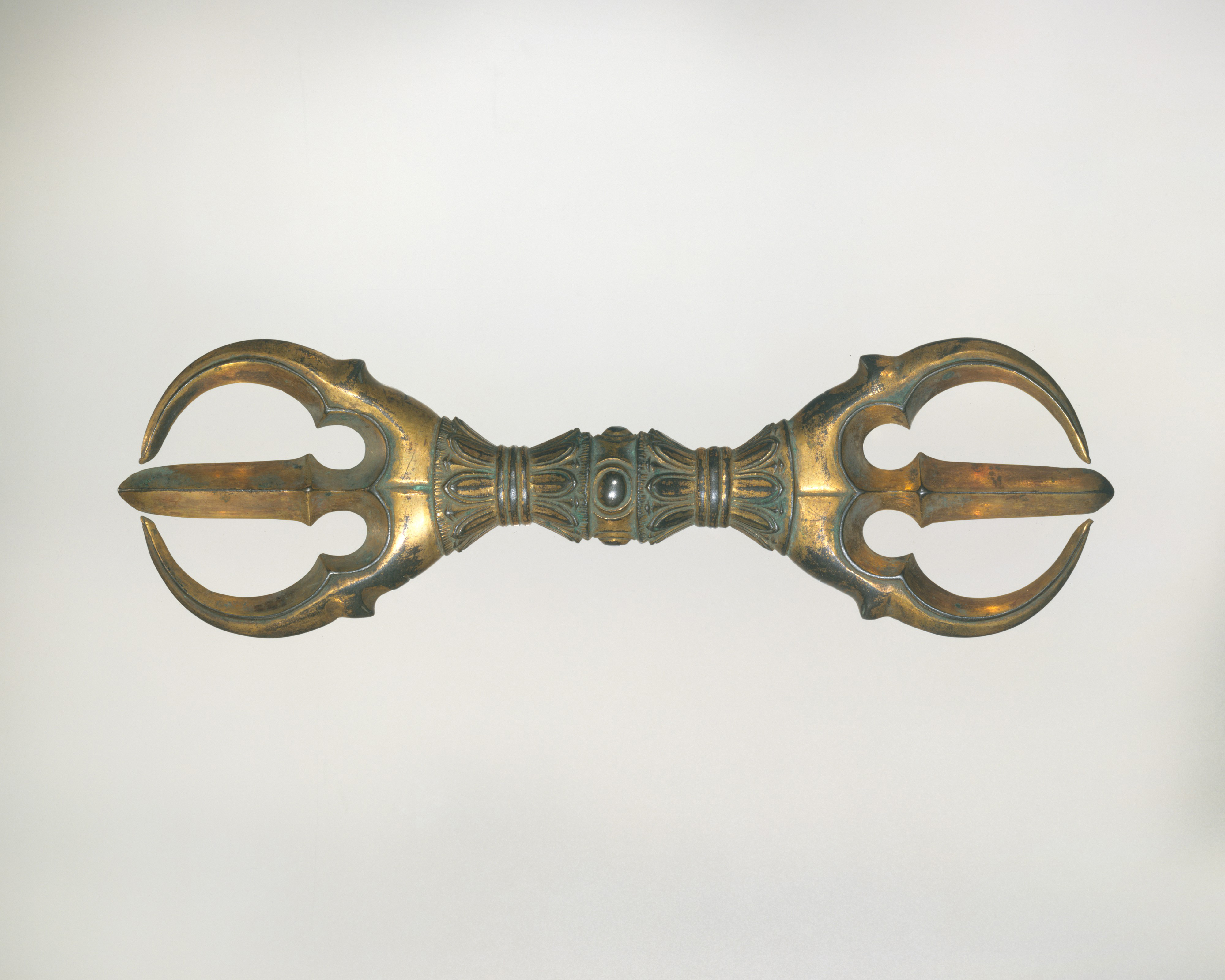 密教佛教的儀式與咒誦中,一組金剛杵與金剛鈴常會被置於銅製法座之上。( MET)