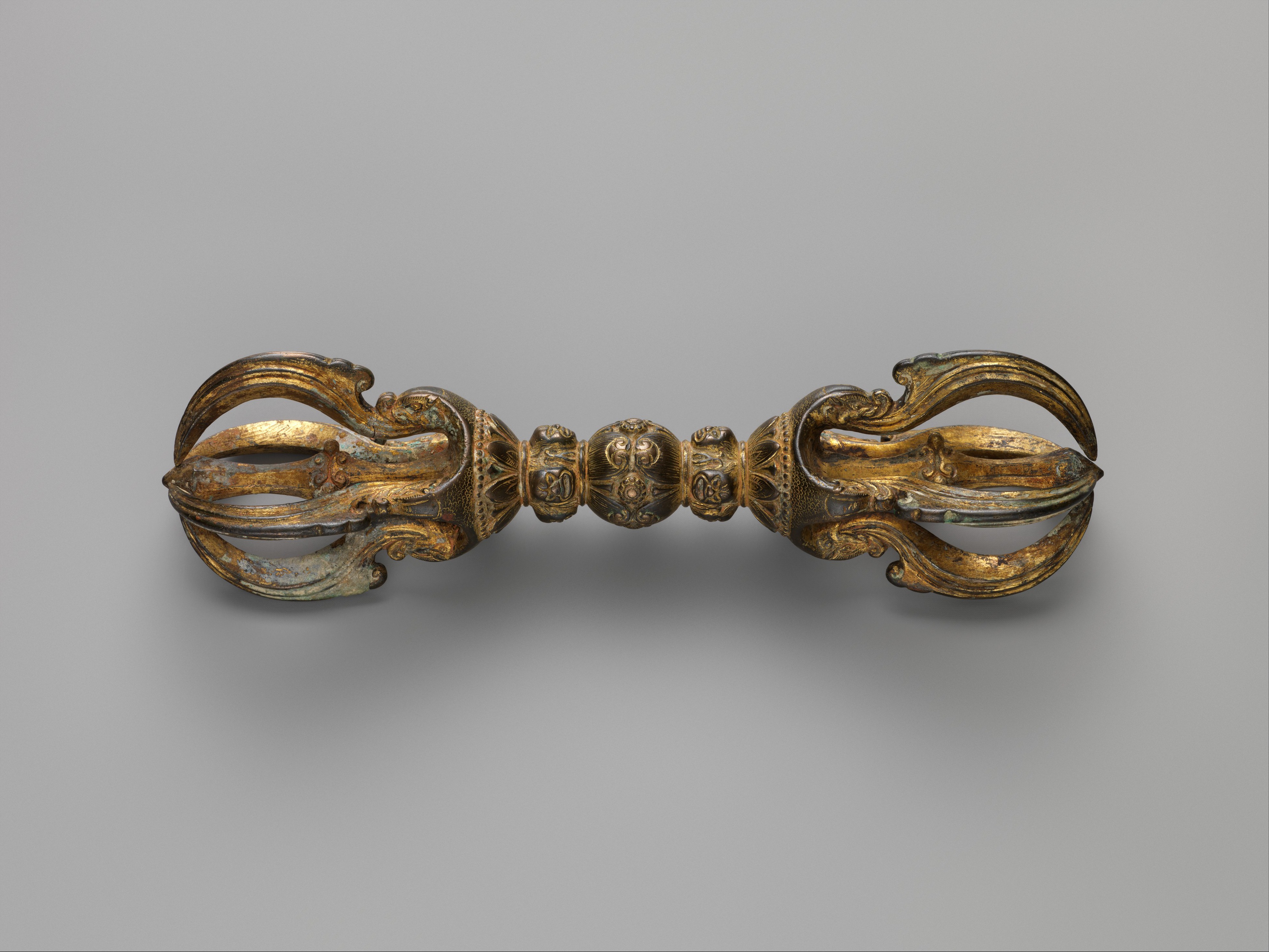 這件精雕細琢的金剛杵遵循傳統的五股設計,其中一股位於中央,四股分列四方。中央主股被四根葉狀弧形尖齒環繞,這些尖齒從摩羯(makara,印度神話中的水生混合獸)之口中伸展而出,展現了印度風格的裝飾元素,使這件法器具有正統的宗教意涵。此金剛杵上精細的蓮花圖案與環繞的忿怒面相紋飾,暗示其密教用途。使用金剛杵作為法器,能使修行者與本尊相應,象徵着如金剛般堅不可摧的覺悟能量。( MET)