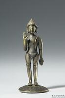 誕生佛立像 銅佛立像,此像頂有肉髻,眉間有白毫,臉型圓鼓,鼻準豐厚,人中短,唇厚,項有三道環紋;全身赤裸,僅自左肩斜掛一條巾帶,立於一圓形銅座上,座有蓮瓣紋邊飾。右手向上作無畏印,左手向下施與願印,為一尊誕生佛像。為印度喀什米爾作品。