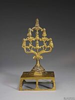 七佛坐像組 四角形臺座,前後各有兩個壺開光,座面另置一六角形臺座,座頂為花苞狀,自此展開一卷葉,葉中伸出四蓮莖,曼妙生長,七位坐佛被安排成三層,整齊中不失錯落與變化之美。從隋代開始,中國就有將七佛合組一座的佛教造像,七佛代表的是釋迦佛和其前的六佛:毗婆尸佛、尸棄佛、毗舍浮佛、拘留孫佛、拘那含牟那佛、迦葉佛。而此像用以連接七佛的圖像—蓮莖和唐草,則是唐代非常流行的圖像元素。此像造型與贈銅000173相仿,乃一組之作。