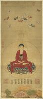 明鄭重無量壽佛 一大圓相。調御現中。三身四智。卐字當胸。不色中色。不空中空。如如堂堂。而非神通。天花繽紛。法雲滃濛。跏趺义手。萬有歸宗。歙人著筆。齋沐致恭。幻中福緣。詎曰心蓬。壬寅(西元一七八二年)孟秋御贊。