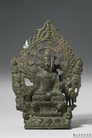 青銅佛趺坐像 巴基斯坦地區作品,背光疑非原件所有。一佛於獅子座上結跏趺坐,座下尚有一蓮臺。佛右手施與願印,左手握衣角,身著通肩式僧衣。獅子座側,二供養人屈膝而脆,雙手合什,以示禮敬。佛像的背光由一邊飾火焰紋的大形圓光和二菩薩像組成,二菩薩腰擺臂移,作三折扭姿,頭頂各有一化佛,圓光頂部尚有頂繫飄帶的舍利塔。與贈銅000050相較,此像之寫實性減弱,作者以規律化的弧線表示領口衣褶,手肘處的衣紋雖起伏有致,重韻律性的變化,但和肘部關節的動作毫無關係,胸部平坦,贈銅000050中所見胸肌的圓鼓和彈性,在此已無迹可尋。這些都足以說明,斯瓦特造像的發展已由寫實逐漸邁向形式化。