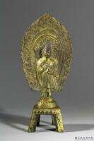 銅鎏金藥師佛立像 本器為韓國作品。銅鎏金立佛,髮頂高起,臉豐圓而表情安詳,右手曲舉,袒右肩,立於袍服上的長弧線刻劃出衣服柔順的樣態,而袍服表面的高低落差,也顯示了稍厚的衣物質感,這與佛像腰部細瘦造型相配,遂在莊嚴中透著些許的清癯之氣。