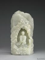 玉佛山 玉雕一長形岩山,中琢一洞,洞內浮雕一佛像,閉目而坐,雙掌相疊,衣袖翩翩。岩山右上方琢乾隆皇帝題識「一切有為法如夢幻泡影,如露復如電當作如是觀」;左上方琢乾隆皇帝題識一文,款題「壬子(五十七年,1792)清和朔日御題并識」。