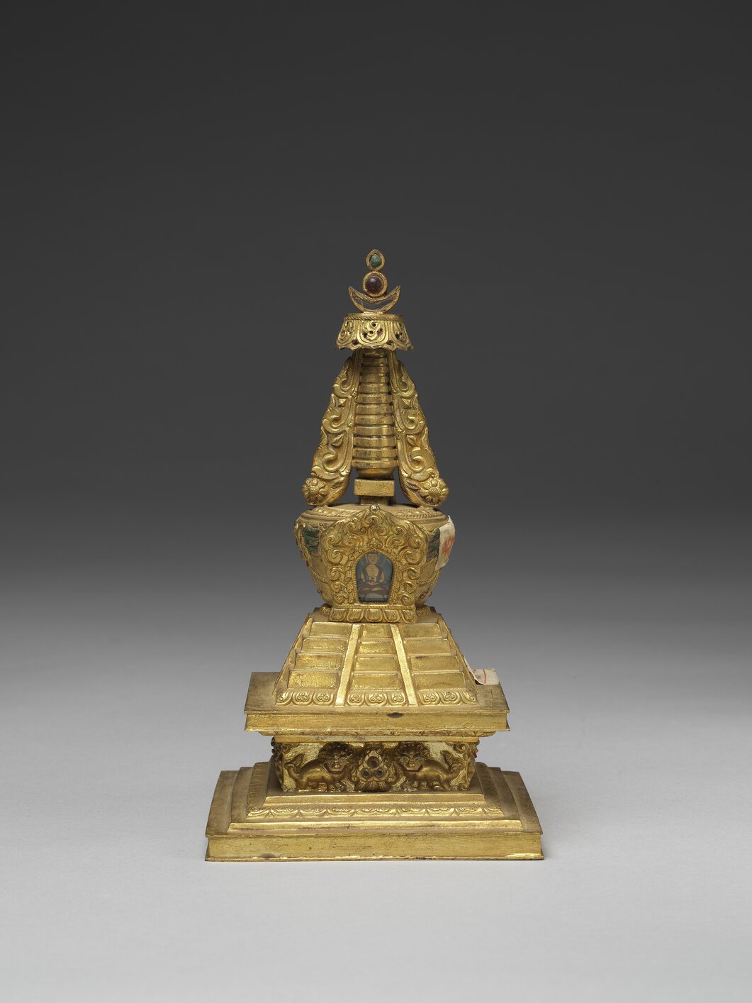 - Gilt copper Devavatara stupa with glass inlay