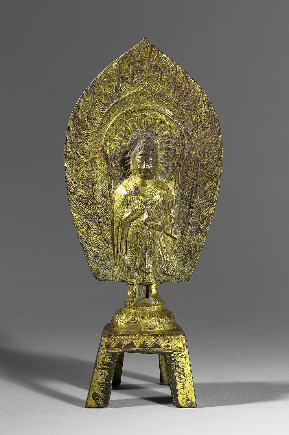 中國北魏佛像,方台腳上刻有「太和九年」(西元485)年銘記;於方台上鑄一蓮台,上立一佛,右手施無畏印,身著通肩式僧衣,衣紋繁密,佛的頭光內有一蓮瓣紋飾背光,更有火焰紋,刻劃細緻精工。此佛身材比例頭大身小,衣飾於末端往外飛出,成三角狀,批肩掛衣,腳裸粗短,呈現了北魏當時特有的鑄造風格,既受到北方民族影響,也呈現了中國特有風格,尤其此尊佛像形體粗曠,字體書寫隨意,然雕刻細節鑄造精細,從紋飾、主體、背光皆有繁複的雕刻表現,呈現了一種對比的趣味性。 - 格式