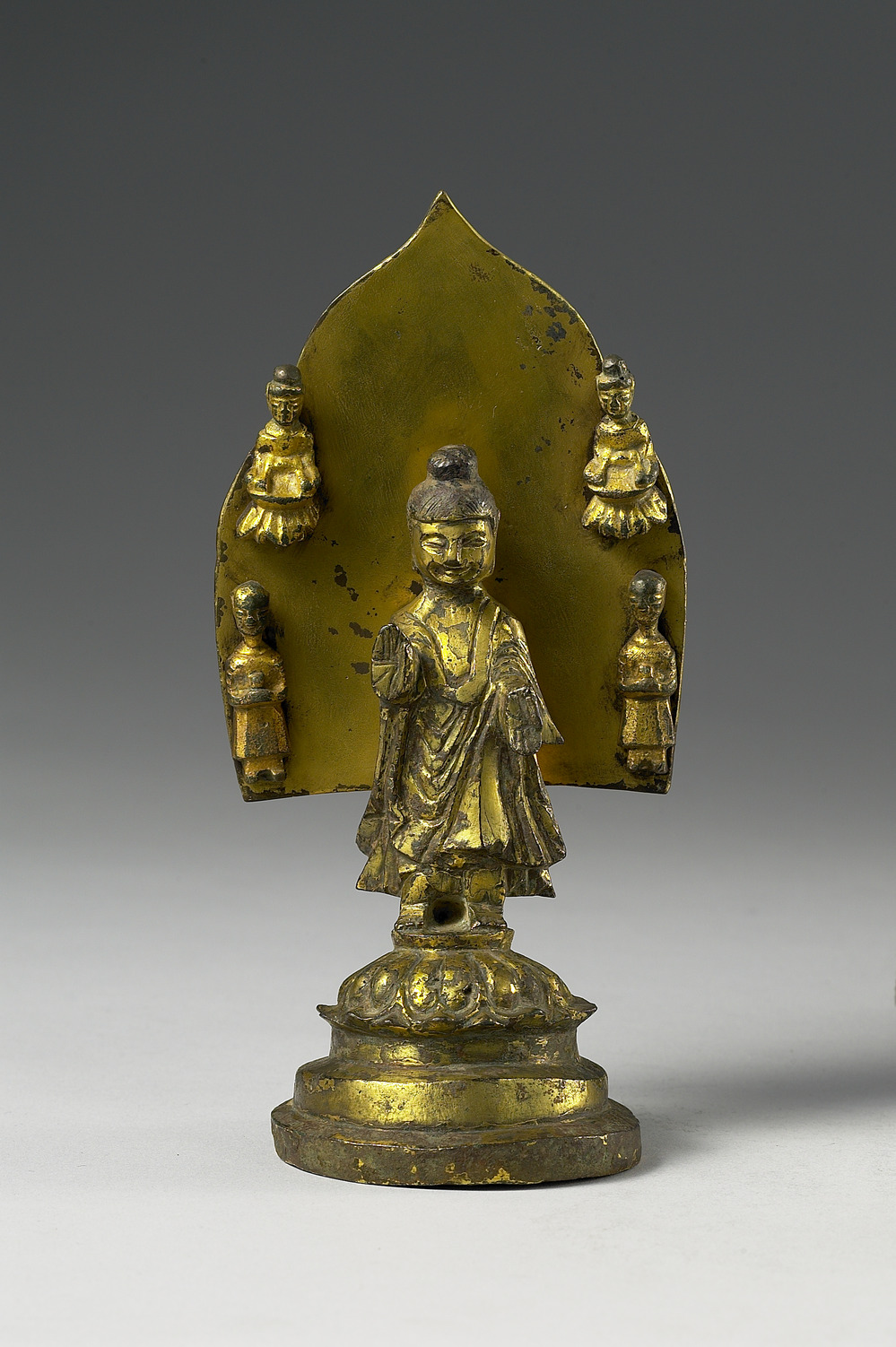 中國彌勒佛金銅佛像,主尊身材矮小,成正面觀,肉髻圓巧,方臉圓潤,神情微笑,金光閃耀;右手施無畏印,左手施與願印,僧衣垂墜,往右方斜,於末端處尖角收尾,稍呈三角狀,全尊立於蓮台之上。附件背光無紋飾,從右上至左下刻有立體小佛四尊,上二尊為坐像,左於蓮座之上;下二尊為立像,合手成正面觀。上下四佛顯見神情五官皆異,與主佛形體也稍有不同,形成當時五胡十六國文化融合的佛像鑄造特徵。在佛像的意義上而言,多寶佛為過去佛,釋迦牟尼為現在佛,久遠的未來有彌勒佛,彌勒佛的信仰與發展影響韓日兩國彌勒信仰與圖像,東晉道安曾率弟子法遇,僧輔,與彌勒佛前立誓,中國彌勒佛信仰遂正式成立。 - 格式