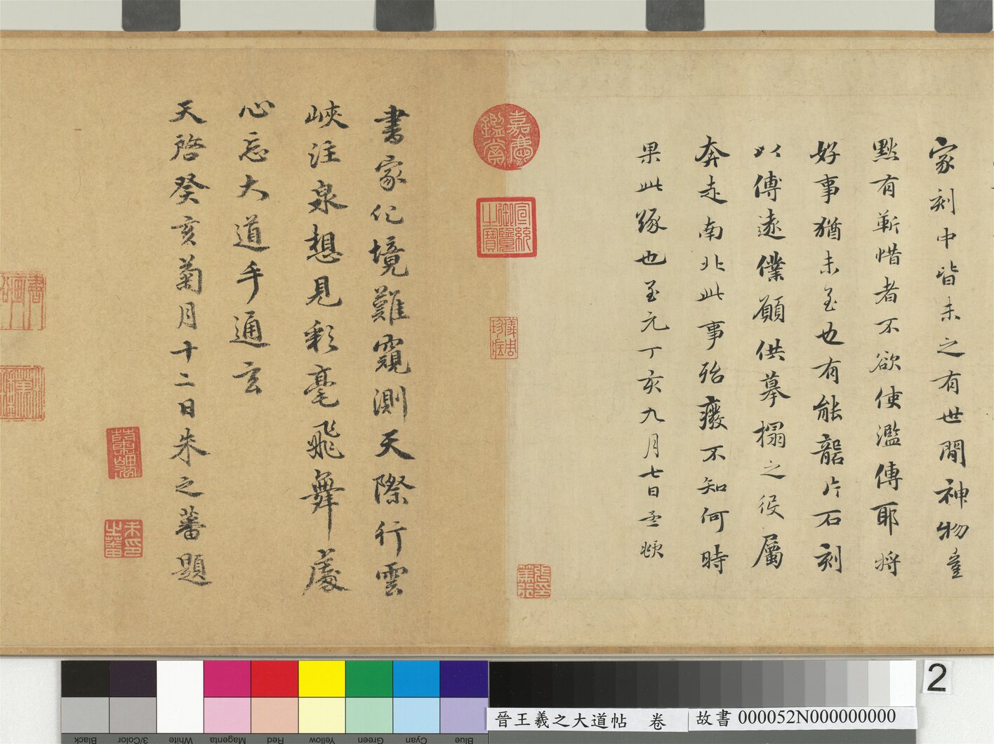 Description:This work, consisting of two lines of semi-cursive script, is named after the first two characters. The contents translate as “The Great Way (Ta-tao) has not descended for some time, so how is it not first so?” The paper attached afterwards includes a colophon written in 1287 by the great Yuan master Chao Meng-fu (1254-1322), who believed it to be a special work like a “dragon leaping through Heavens’ Gate or a tiger lying at Phoenix Pavilion.” The brush strokes here are plump and rounded, with the first character “ta 大” to that of “hsia 下” done in continuous brushwork. The last stroke of “yeh 耶” is also quite elongated, the lifting of the brush being coarser to form a curving arc shape. Judging from surviving works and rubbings of engravings, however, Wang Hsi-chih did not practice in the style shown here, so some connoisseurs believe this to be a T’ang dynasty (618-907) copy. On the other hand, many scholars also consider this to be a freehand copy by Mi Fu (1052-1107) in the Northern Sung period. (20081012)