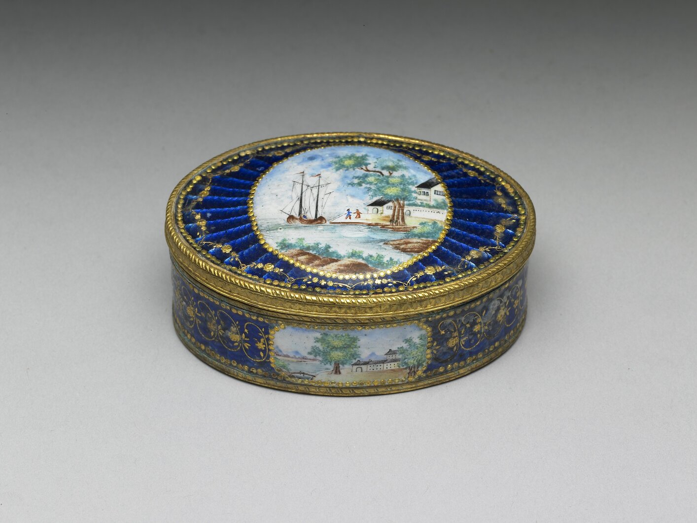 - 長8.1公分 寬5.7公分 高3.2公分。銅胎蓋盒,盒身邊緣有雕銅花邊,蓋與器壁皆開光彩繪西洋風景畫,其餘以藍色透明琺瑯並以金箔刻花琺瑯裝飾,底為藍色琺瑯。一組共九件(故琺6-14),合儲於雕福壽木盒中,內有糊橘色綾與錦座。罕見成組盒裝西洋琺瑯盒,或為廣州生產,應為進貢之用。