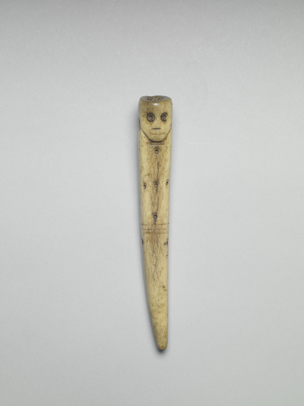 此件取獸角製成,尖端朝下,正面上端浮雕出一人面,以圈點紋為眼紋(陰刻單圈為眼形,中央深鑽一圓心為眼瞳),眼下方中央並陰刻一短橫線與一長橫線為鼻與口。人面下方陰刻一道為頸部,器之中段部位繞器陰刻三道橫線以間隔出身軀,身軀部位依上下左右中各陰刻一圈點紋(單圈中鑽一圓心)。同樣的圈點紋亦飾於器側三道橫線之上方與下方,以及器背三道橫線下方。器之上端人面兩側於同一部位各穿一圓孔,可繫掛。這件磋角人首紋錐與西夏開國皇帝李元昊的行宮遺址中發掘一件人頭形鹿角質製成的解錐相似,但後者更形儉樸。