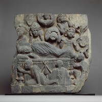 According to the Buddhist chronicles, when the Buddha died near the city of Kushinagara, in northern India, he broke free from the cycle of rebirths and attained nirvana, absolute release from karmic rebirth. This panel, which would have been displayed in the harmika enclosure at the summit of a stupa (relic mound), shows the Buddha surrounded by lay and monastic mourners expressing their grief. These reactions are contrasted with the calm of the monk Subhadra, seated facing the Buddha’s corpse, who alone comprehends the true meaning of the Buddha’s death. Images of the Buddha’s paranirvana based on this Gandharan prototype became important icons for veneration across the Buddhist world in the following centuries.