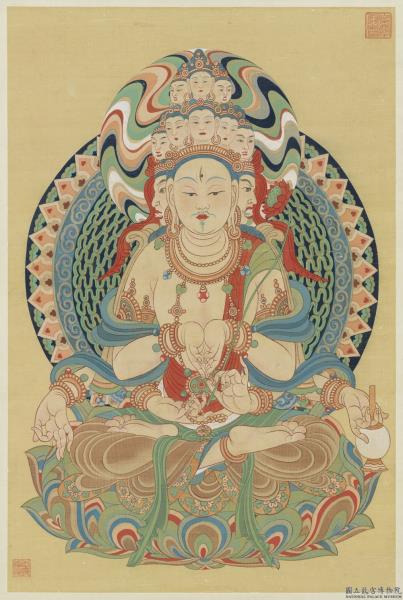 張大千(1899-1983),四川內江人。年輕時拜曾熙、李瑞清為師。對日抗戰期間,曾遠赴敦煌等地臨摹壁畫,計兩年有餘,對敦煌藝術之發揚光大,貢獻厥偉。六十歲以後,又開創了潑墨潑彩的畫法,為當代享譽中外的藝術大師。 此圖摹自敦煌莫高窟第十四窟之晚唐十一面觀音像。人物體態豐腴,線條圓轉流暢,著色則以礦物性顏料為主。雄健的特質,已一洗大千早期畫仕女柔弱淡逸的風格。 張大千先生捐贈於民國58年。(20110204) - 時間點