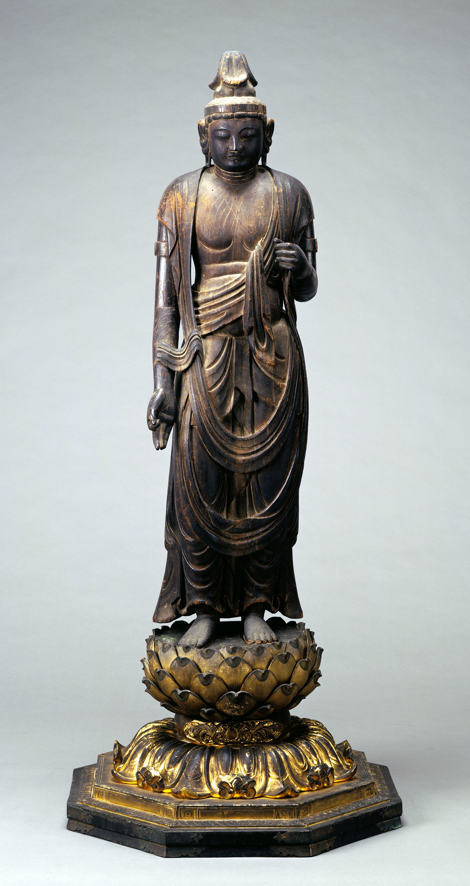 內容描述:日本自飛鳥時代起製作了許多佛像,得到了人們的信仰。其中對認為將眾生從疾病和災害等危難中拯救出來的觀音菩薩,特別是對十一面觀音的期待尤其大。為此,不同時代和地區都有受歡迎的觀音菩薩像和十一面觀音像。 本像也是其中之一,貞觀年間(859~77),奈良大安寺僧人一演(803~67)在京都鴨川西岸河崎創建了感應寺,相傳本像為其寺院正尊,平安後期作為洛中屈指可數的靈驗觀音像得到了宮廷顯貴的尊崇。此外,從曾安裝在本像髮髻周圍的小佛面的痕跡來看,認為本像以前曾是十一面觀音像。感應寺在享祿4年(1531)燒毀後衰落,本像也被遷移到了清和院。不過,到了近代本像作為洛陽三十三觀音之一,又重新得到了當代民眾的信仰。 本像充分體現了平安時代前期獨木雕像的特色。從髮髻至足榫都是由榧木獨木雕刻而成的,且未做挖空處理。雖然目前為立榫狀態,但是原先本體至蓮花台蓮蓬都使用了同一塊原木。身軀為高腰身,一副悠然自得的樣子。下半身軀體寬厚結實。腰部略扭,右腳微微踏出的立姿略帶一些運動感覺。條帛和裙子上雕刻著重複著大波小波的翻浪樣式衣紋,但做得十分簡潔,不過於惹人注目。 能夠感覺到富有彈力緊繃的肉體等,與大阪觀心寺如意輪觀音坐像和京都神護寺五大虛空藏菩薩坐像等承和年間(834~48)前後的作品有相近之處,但其端正的面龐和翻浪式衣紋等更增添了一份精煉,從這一點能推定其製作時期為9世紀後半葉。堪稱平安時代前期雕像成熟期的典型優秀作品。