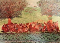 祈願觀音殿內〈人間淨土圖〉為聖嚴法師於法鼓山園區開山前3年,邀請知名陶藝家連寶猜,以質樸的筆法繪製一幅靜謐祥和的陶版畫,作品匯聚世界各宗教、族群以及娑婆世界各類有情眾生,呈現出聖嚴師父人間淨土的構思。