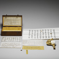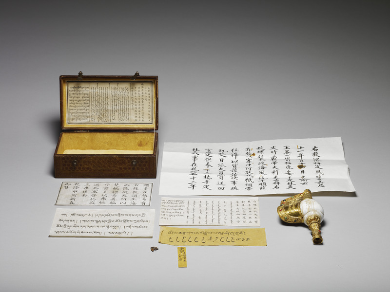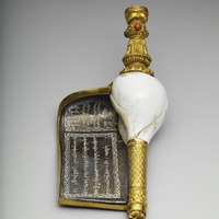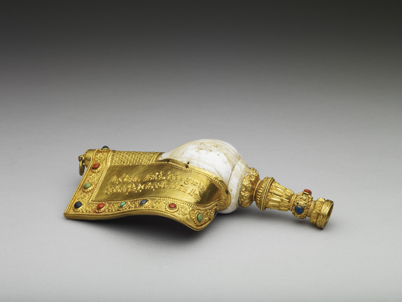 印度聖貝,螺體上下加鑲鍍金裝飾吹口及護板,吹口飾蓮瓣及卷草紋,護板釘接於螺口與底端,內板銀質,刻藏文右旋螺贊詞及漢、蒙、滿、藏文款識:「大清乾隆年製」;外板則鍍金,並敲飾五瓣花式錦、鑄藏文贊詞與卷草紋,緣鑲珊瑚、松石、青金石等,底端刻「乾隆年製」。藏傳佛教法器海螺是法會時吹奏的樂器之一。佛經上講釋迦摩尼說法時聲音洪亮,猶如大螺貝之聲響徹四方,使聞聲者可以驅魔,滅諸罪障。自然生長的螺紋自左向右旋轉,此種右旋白螺少而珍貴。乾隆在其御製《白螺贊》視右旋螺為祥瑞,據說渡海時若供於船頭,便能風平浪靜。從盒內題記看來,此法螺曾用於乾隆五十二年(1787)福康安平定林爽文事件,以保佑其渡海平安。福康安渡海來臺時確實一度受風浪所阻,不知是否得定風神器「右旋白螺」之助,果然順利於乾隆五十二年十月二十九日登陸鹿仔港(今彰化鹿港),展開圍剿林爽文的行動。渡海的驚險 ...