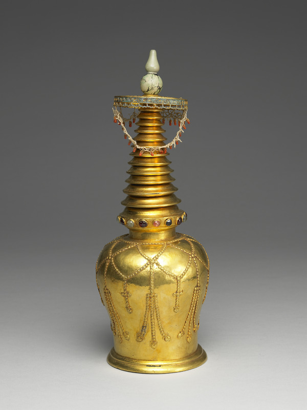 銅鎏金藏式塔,圓塔身,松綠石葫蘆形頂,圓形敲花佛教八寶寶蓋,側邊回紋貼飾翠羽,下垂珍珠瓔珞,珊瑚墜角;塔身飾瓔珞紋,並鑲嵌各色料石。