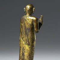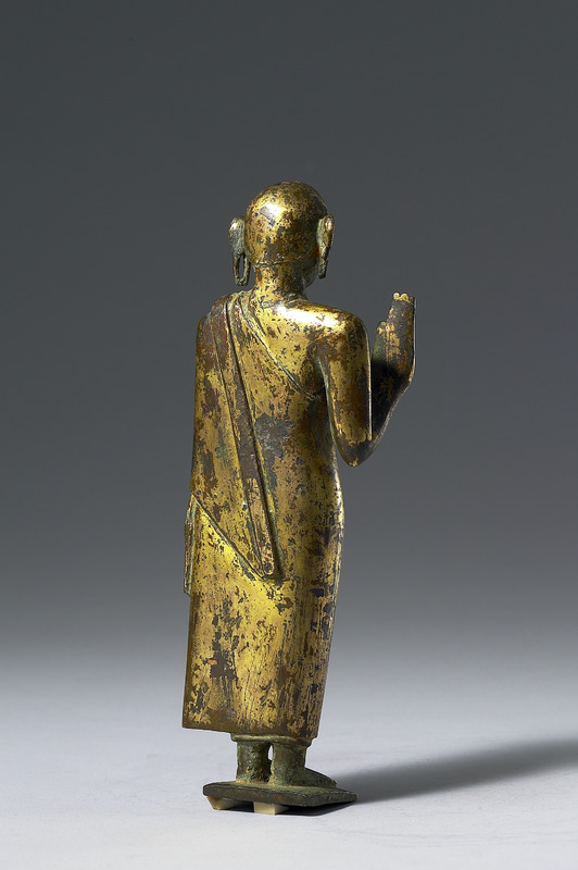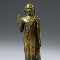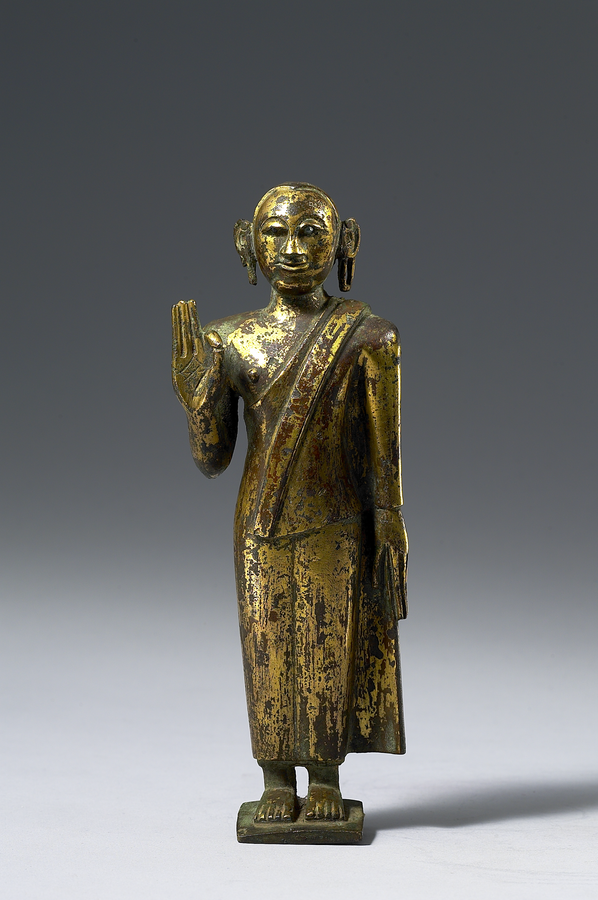 青銅鎏金佛立像,斯里蘭卡地區作品,年代約為十八世紀。佛臉蛋渾圓,溫顏微笑立於方形小台座上,著右袒式僧袍,衣薄貼體,耳掛一對大耳璫,右手施說法印,掌上有線刻符號,疑似法輪,又似花卉,左手垂直朝下,緊貼僧袍,整體姿勢動作雖然拘謹生硬,但軀幹線條尚稱自然,整體氣氛安詳平和。佛之左眼似以半寶石鑲嵌而成。這尊斯里蘭卡立佛具有典型的康提王朝(Kandy Kingdom,1592-1815)佛像風格──立佛寬闊近乎方形的肩膀略微斜下,垂下之左臂和肩膀成直角,軀幹體積堅實,這種造型繼承了斯里蘭卡佛教晚期造像的保守風格。斯里蘭卡以上座部派佛教為主,上座部派佛教嚴謹的戒律思想,反映在造像上形成拘謹保守之風。佛像掌中刻有花卉等圖案花紋亦是康提造像特徵之一。