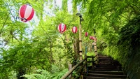 向上 木階拾級而上,象徵成佛之道需不斷前行與精進。兩側鬱鬱蔥蔥的綠林覆蓋,清新而靜謐,彷彿提醒修行者在向上精進時需保持內心清淨與寧靜。懸掛於道路兩側的紅白燈籠,引領方向,宛如佛法的明燈,照亮前方未知之路。整體畫面充滿生機與希望,蘊含禪意,激勵人們在修行之途堅持信念,持續精進,逐步邁向覺悟與自在的生命境界,展現佛道上的光明與祥和。