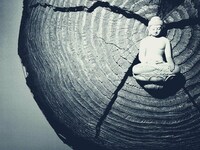 佛相 一尊佛像安坐於橫切的樹幹年輪上,象徵佛性與眾生生命的緊密連結。年輪的細密紋路與裂痕,喻示著眾生生命的歷經風霜與無常變遷,而佛陀安詳的姿態則提醒著每個生命皆具備超越苦難、覺醒成佛的可能。整體意象傳達了佛法深入世間、安然自在的境界。