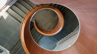 圓頓 俯視視角下的螺旋樓梯形成優美圓環,象徵「圓融無礙」與「離相寂靜」之境。木質扶手溫潤如禪,沿著階梯蜿蜒下行,彷彿引導眾生循著法門,漸次遠離執著,趨向圓滿覺悟。光線從樓梯間灑入,映照出陰影與實體交織的和諧,猶如般若智慧中所見:色即是空,空即是色。此構圖呈現動中有靜、靜中有動的禪意,是視覺與心靈交會的「圓頓」象徵——不立文字,離言說相,而當下即是道。