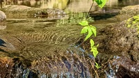 淨土 照片攝於法鼓文理學院,一株嫩綠的小葉從石縫間探出,靜靜地傾向清澈流動的水面。溪水自石上滑落,泛著光影交織的漣漪,彷彿時間於此放慢了腳步。陽光灑落在葉片與水波間,整體畫面如詩如畫,清淨無染,展現自然中那微小卻無限的生機。此處不僅是一幅美麗風景,更是心靈的「淨土」,象徵修行人於俗世之中,亦能於當下見道,於一滴水中見法界,於一株葉中悟菩提,返本歸真,靜觀自在。
