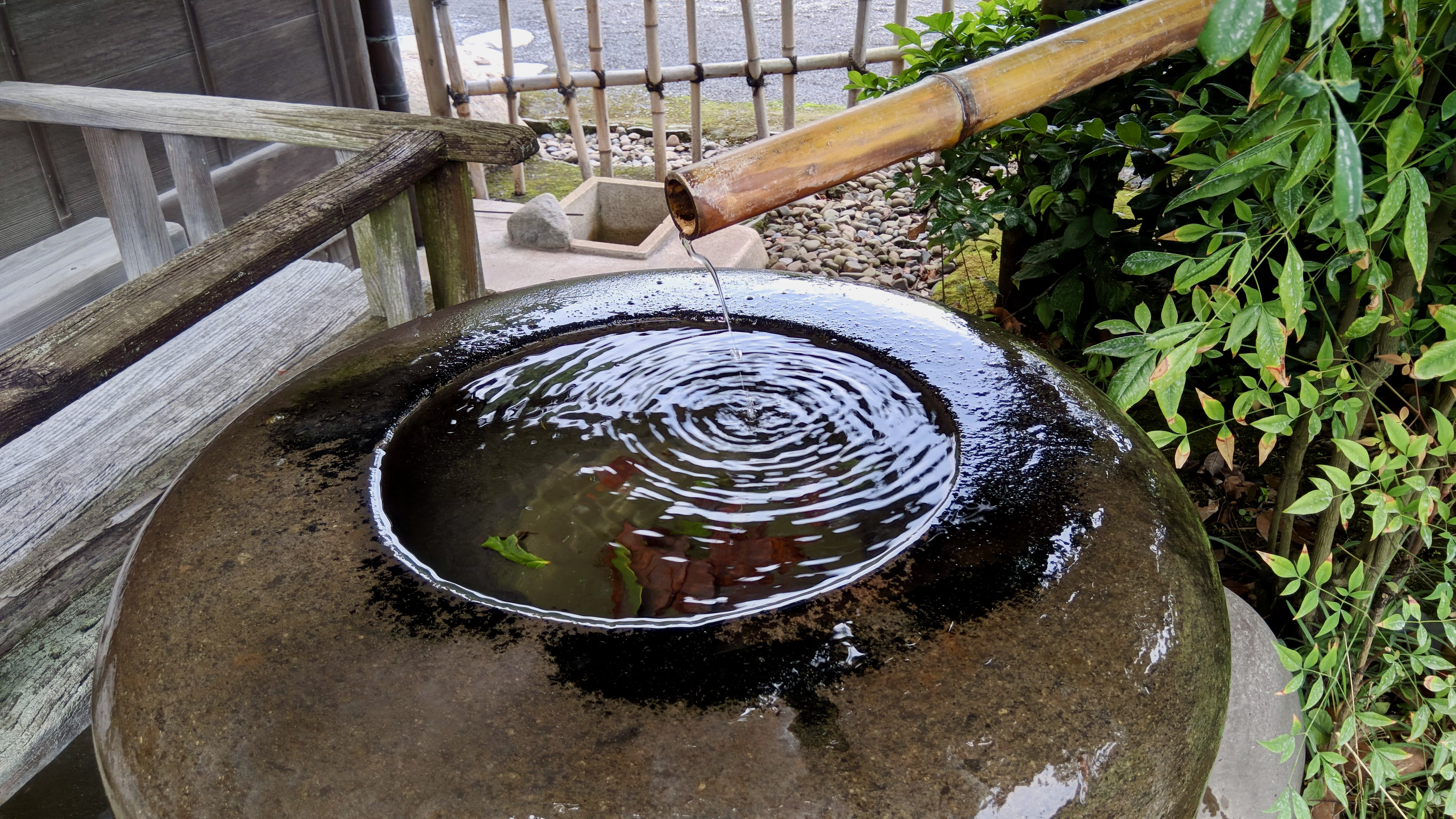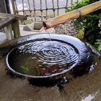 - 細流從竹筒中輕緩地滴落於石缽內,形成一道道寧靜的漣漪,寓意修行之路猶如涓涓流水。修行並非一蹴可幾,而需每日堅持,持續累積善行與智慧,如同點滴之水終能盈滿石缽,圓滿無缺。青翠的植物與古樸的竹石環境,更添禪意與安定感,提醒修行者於忙碌的世間保持內心寧靜,持之以恆地精進修持,最終必能證得圓滿無上的佛果。