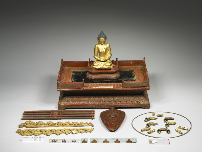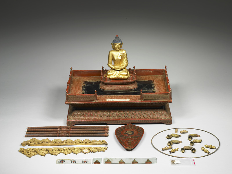 清宮作品,十八世紀。小佛像,結跏趺坐,成禪定印。木胎雕成,外表簡單的髹塗金漆與紅藍彩。原置於漆龕內。
