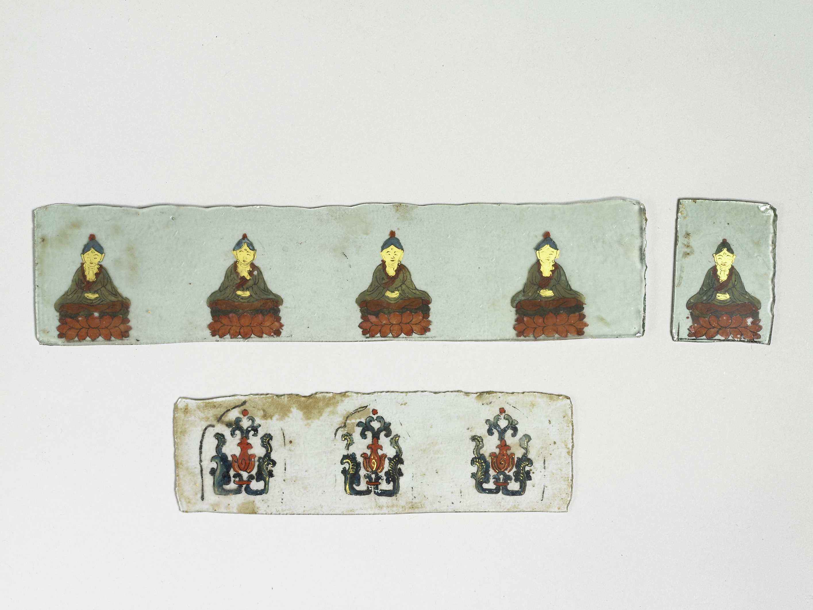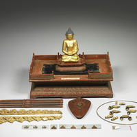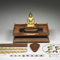 說明 清宮作品,十八世紀。小佛像,結跏趺坐,成禪定印。木胎雕成,外表簡單的髹塗金漆與紅藍彩。原置於漆龕內。 - 時間點