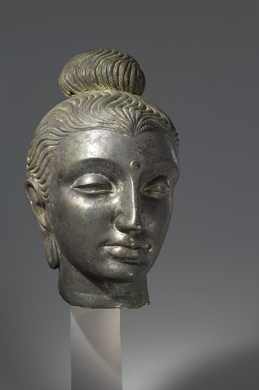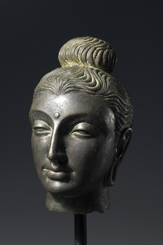 銅合金佛頭像,二十世紀巴基斯坦作品,犍陀羅藝術風格。犍陀羅(Gandhāra)是古印度的一個地名,位於今日巴基斯坦北部與阿富汗東部一帶,在西元一世紀至320年之間古印度的貴霜王朝統治期間,犍陀羅是當時的佛教造像藝術中心之一。由於犍陀羅早在紀元前即曾受希臘亞歷山大大帝占領,後又受希臘化文化一支的大夏(Bactria)統治,加上貴霜王朝時期與羅馬帝國有貿易往來,因此文化與藝術深受希臘羅馬的影響,其造像風格保留希臘羅馬色彩,具寫實風格,佛像經常具有波浪式的卷髮,深目高鼻等西方人輪廓特色,本件即具有此風格。此佛頭頂有肉髻,眉間現白毫相。髮作波浪式,髮絲仔細刻劃。鼻高而挺,雙眉、雙眼和唇形均用線條勾畫,五官輪廓更加突顯。