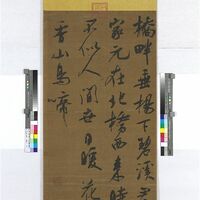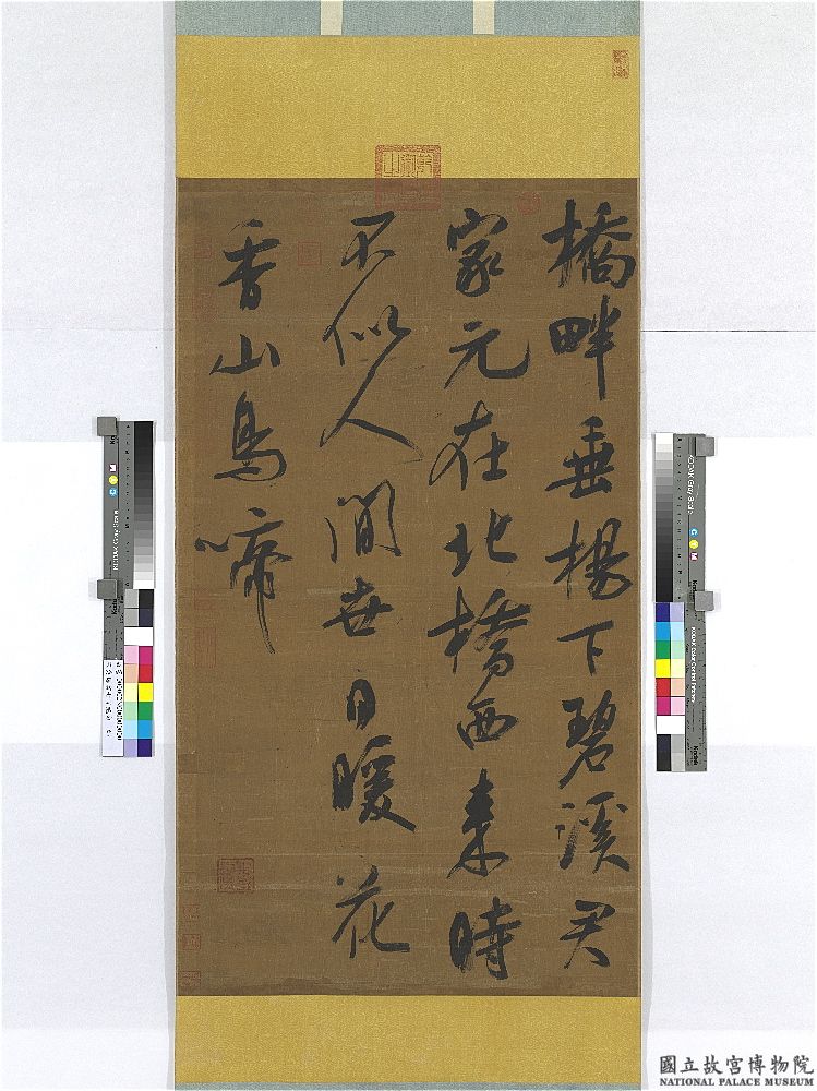 吳琚(活動於十二世紀後半),開封人。他的父親吳益是南宋高宗吳皇后之弟,母親是秦檜的孫女。雖是外戚權貴之後,卻並不自驕,詩文書法俱佳。 此幅七言絕句書自蔡襄詩,是少見的宋代掛軸書蹟。吳字挺拔俊秀,結體和姿態都宗米芾,但是和北宋書家筆筆送到的工夫相較,吳琚的運筆快速強勁、行筆不時出現飛白,顯示南宋書家對上下呼應與整體氣勢追求,甚於每一字的精工與錘鍊。