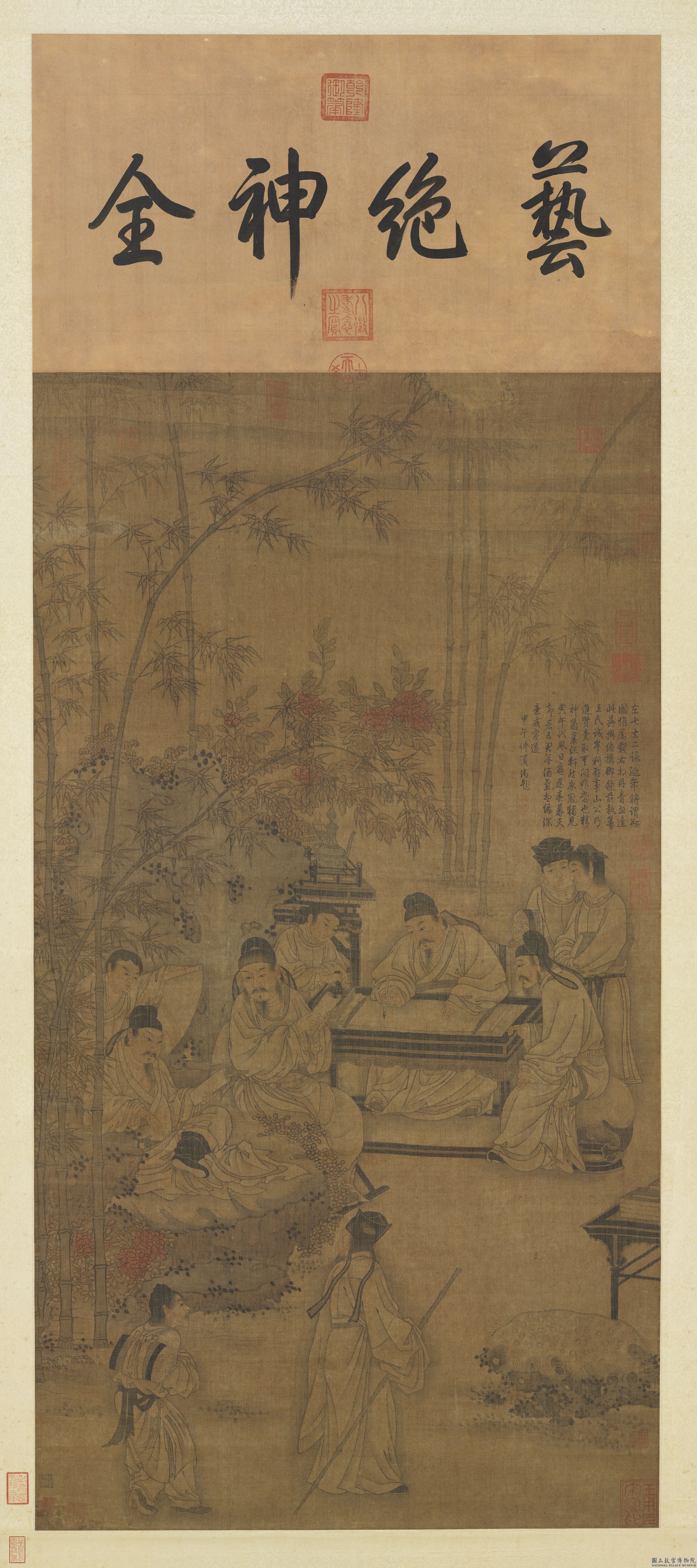 閻立本(約西元七世紀),榆林盛樂(今綏遠和林格爾)人。他和他的父親閻毗,哥哥閻立德都擅長於繪畫。曾奉令描繪各邦蠻夷、職責、鹵簿、秦府十八學生、凌煙閣功臣等圖像。 畫中有清高宗題討,高宗認為這幅畫是描繪「晉竹林七賢」稽康、阮籍、山濤、向秀、劉伶、阮咸、王戎,其中王戎與山濤沒有畫入圖中。左下角的竹桿上有「閻立本畫」的款字,當為後人假托之作。