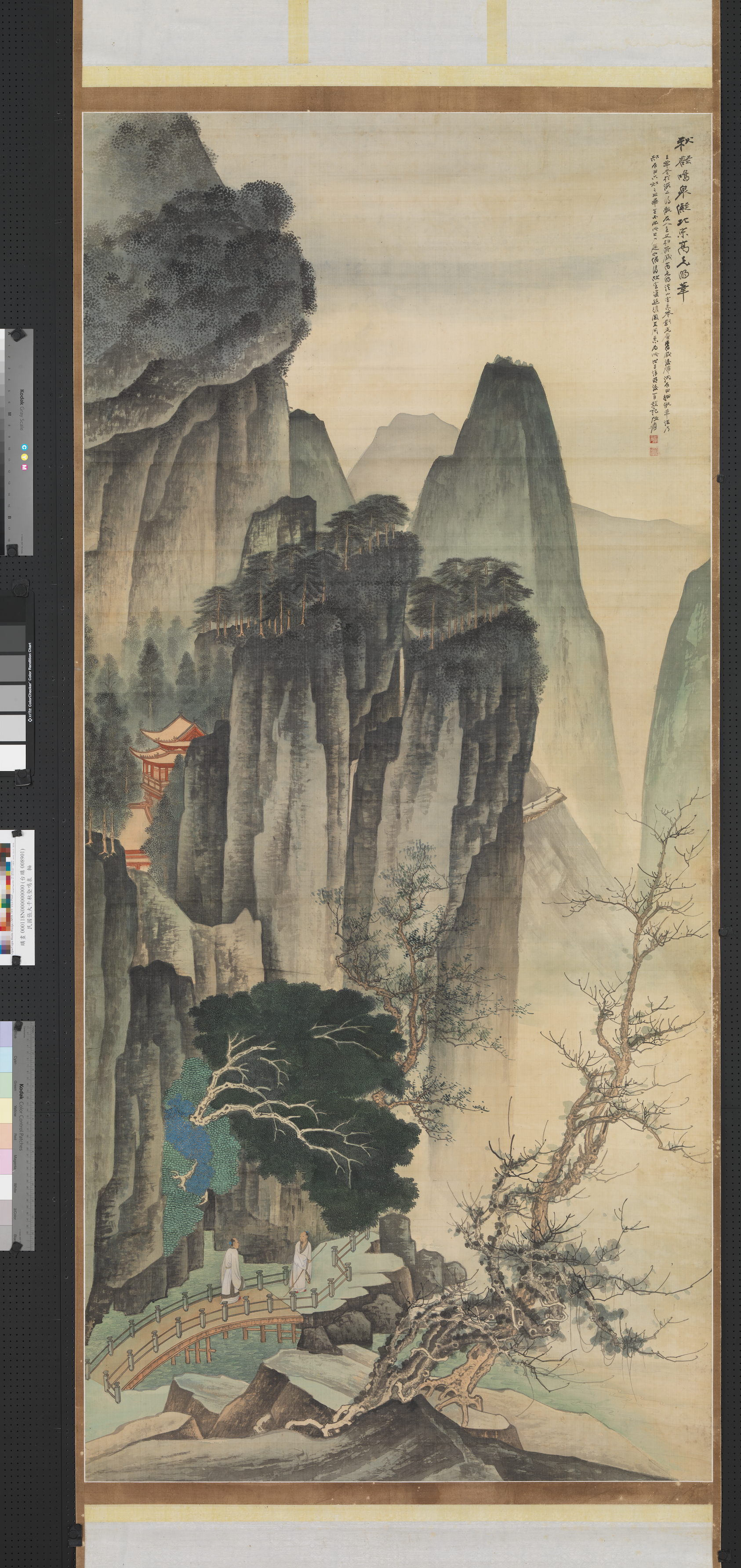 - 秋壑鳴泉。儗北宋高克明筆。去年冬於海上得觀友人王文柏所藏高克明溪山雪意卷。劉完庵舊藏。後歸沈石田。細翫筆法。乃知石田六如二公畢生不出此公戶庭也。偶得故宮雙絲絹。因其用意為此。戊子(西元一九四八年)清明後一日題記。張爰。