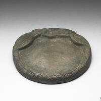 陶質,色暗灰,質地堅細硯面有小氣孔。圓形硯,周起寬棱,硯面居中,一側邊框較寬微有裝飾,因舊傷缺而不可辨,邊框較窄側有溝槽為硯池。硯背作瓦當樣,圓壁形面一分四格,分書「億、壽、無、疆」篆體,現收於圓形木盒中。