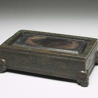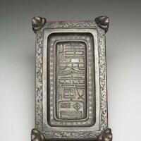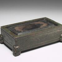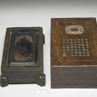 - 硯作長方形,有四足,名為石渠,似是澄泥。受墨處微窪下,周環作渠,硯額上方作墨池,斗檢式,硯面周緣浮雕雲雷紋,然已漫漶不清,硯色紫中泛紅,間有青綠色、溫潤而澤,硯壁兩側各淺浮雕兩螭,兩端各有一螭,四足刻以獸面紋,硯背覆手窪下作兩層,上層周緣刻水草紋,連連不斷,中央窪下刻陰文「漢墨藏寶」,四字篆文,中周緣刻乾隆御題詩乙首:「寶藏漢時墨,器類楚王磚,質異洪家譜、珍傳朱氏編,陶泓信此耳,居默彼誰焉,設寄鳳池客,寧知八影遷。」款題:「已未春御題」,按「乾隆已未」,為乾隆四年(西元1739年),有鈐印一:「永寶用之」。《硯譜》云:「是硯刻樓,俱極古雅、有刀法、編裹清綠砂斑,尤有寶色,如古鼎彝,體質瑰厚,較唐石渠硯更為渾穆。」