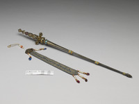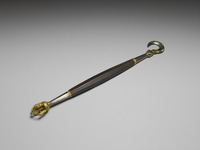 說明 喀章嘎又名天杖,起源自印度早期密宗瑜伽師的手杖,是以木棍插在婆羅門的顱骨作為標誌,後來演變成明妃、女神或空行母的持物之一,象徵菩提心的終極境界,大樂和空性的完美結合。喀章嗄的構造複雜,以十字金剛杵和寶瓶連接杖身和杖柄,末端以尖銳的杵收尾。柄為三個頭顱:一血淋淋人頭、一腐爛人頭、一乾枯髑髏,代表斷滅貪、瞋、癡三毒,頂端為金剛杵,代表第六大智。十字金剛杵,代表四大淨色、四業、四無量和四解脫門。寶瓶象徵圓滿甘露,代表大智慧的完成。這件喀章嘎為銀鍍金,杖身飾嵌綠松石箍,附織金繙帶,帶緣飾珍珠、珊瑚記捻和紅、藍寶石墜角,用料講究,不愧為皇家宗教用器。