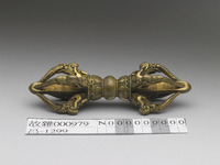 說明 兩端首尖銳,作五股式,摩羯首銜之,手執處飾蓮瓣紋;密宗佛教中,金剛杵象徵摧滅煩惱,能破除魔障。五股杵代表五智五佛。本杵與故雜978之鈴同儲於一皮盒內。鈴、杵是修金剛法者所不可或缺的手持物,左鈴右杵,是慈悲與智慧的象徵