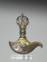 說明 驅邪儀式中的用器,象徵斬斷煩惱的智慧。鐵鍍金的柄端作金剛五股杵狀,下端為彎月形寬刃鉞,以摩羯首銜之;銀色鐵刃的一側為彎鉤狀。附皮盒。