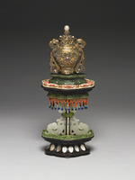 說明 銅鍍金嵌珠寶瓶,頂嵌一珠於蓮花座上,蓋飾如意雲紋,頸及足飾蕉葉紋,腹上飾回紋,腹為菊花紋,下緣為水波紋,足緣飾回紋,兩側有飄帶,單面嵌珠。置於海棠形青玉墩之上,玉上雕滿雲紋,玉下為海棠形蓮瓣紋木座,嵌象牙蓮花欄杆、鏤雕綠色染骨蓮瓣紋邊飾及珊瑚米珠纓絡墜藍色料石墜角;其下承以木質圓柱,以中央綠色染骨雲紋環為界,上下各嵌四隻白玉夔龍;底座為海棠形木座,其上嵌綠色染骨鏤雕海棠、拐子龍紋欄杆,座邊嵌羅鈿葉片。