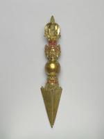 說明 在驅邪儀式中,金剛鐝(普巴杵)是一重要的「武器」,將邪魔消除無蹤,故裝飾往往最猙獰。此件鐵鍍金的普巴杵,甚沉重,在五股杵的柄首蓮座下接三面的佛首,赤髮紅眉,耳戴活環,瞠目齜牙,表情凶惡。鐝端三稜立起而尖銳,有摩羯首銜之。此器似曾用過,尖端略折缺。