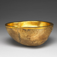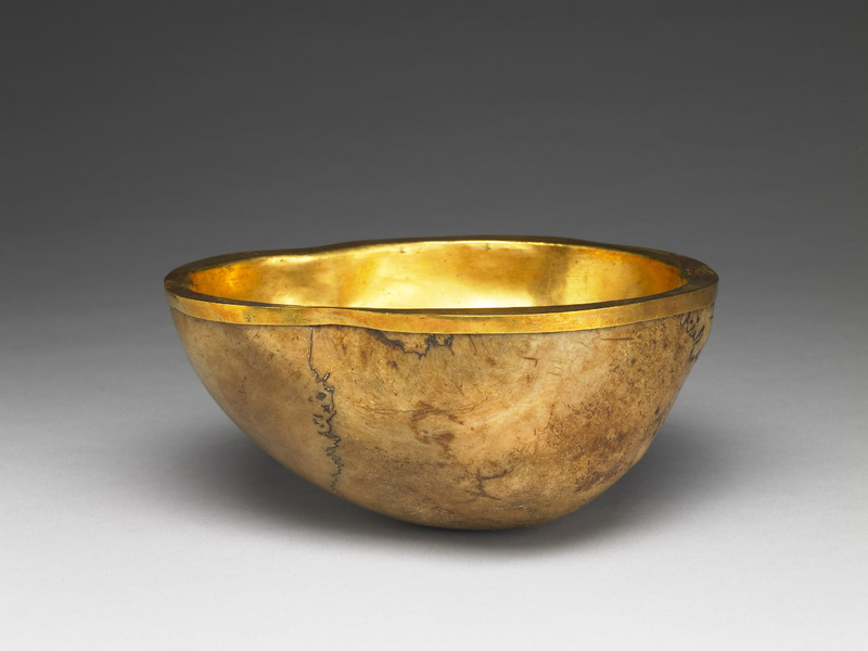 說明 乾隆五十七年(1792),福康安(1754-1796)等率兵平定第二次廓爾喀亂事,時任攝政的第八世濟嚨呼圖克圖(Yeshe Lobsang Tenpai Gonpo, 1760-1810)因籌辦軍務有功,蒙高宗皇帝特頒「慧通禪師」法號。八世濟嚨呼圖克圖為申謝忱,即呈進此件古德嘎布拉供碗。「嘎布拉」是以人顱骨加工所做供碗,乃無上瑜珈密續(Anuttarayoga Tantra)儀式所用法器。此件嘎布拉供碗前側與右側隱見藏文「阿」、「吽」二字,藏傳佛教傳統認為此乃得道象徵,異常珍貴,故呈貢皇帝。碗內鑲金裏,具鑿痕,上配金蓋,下配托座。(故雜1973~1974)金蓋鏨刻八吉祥與纏枝蓮紋,蓋鈕形式為鑲有紅珊瑚、綠松石、青金石之三瓣放光寶珠。