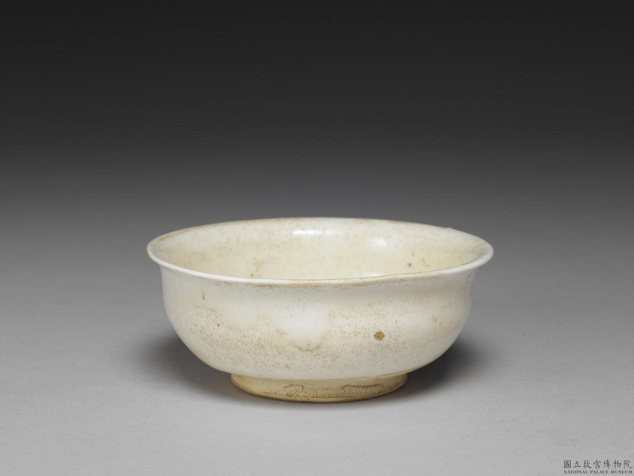碗,侈口微向外卷,弧壁,平底,矮圈足。全器施白釉,足底露胎,釉色泛黃。