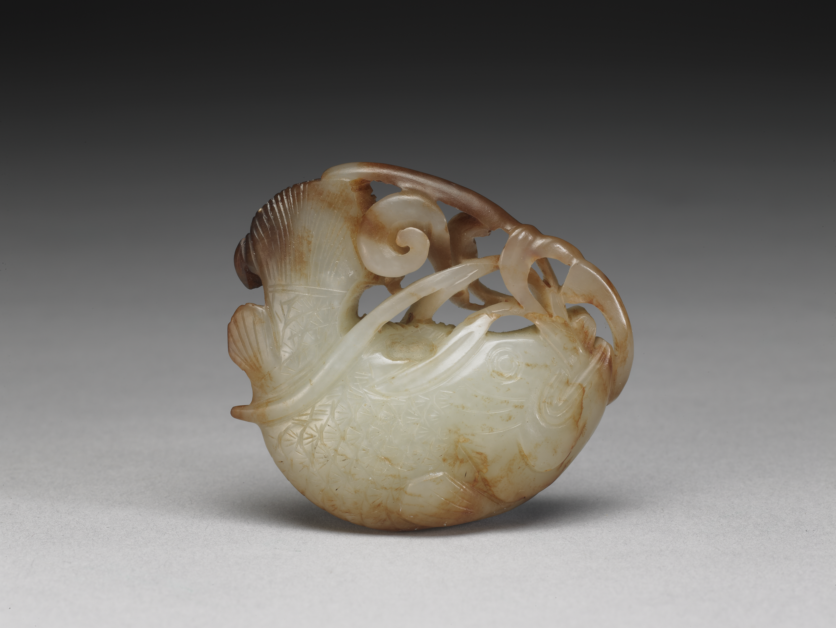 - 玉質,邊緣有大片褐斑,琢一優游水藻間的鱖魚。魚身豐腴,腹部尤其飽滿,然因尾部上揚,線條又極為自然流暢,賦予了強烈的躍動感。陪襯的水藻採多層次鏤空技法,更增作品生動活絡的趣味。