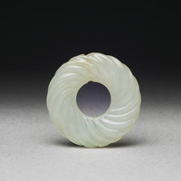 - 玉質,白色,有赭斑。器呈圓形,孔徑略大。周身琢刻繩紋,作向器中心旋入之狀。