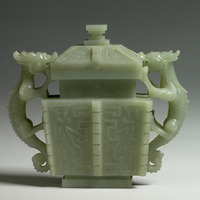 - 青玉質。器呈長方形,附玉蓋,二耳作龍形立雕,嘴抵觸著蓋沿,方圈足。頸部有圓渦紋,腹部為幾何式獸面紋,以雷紋為地,並在四角與兩面加飾棱脊。