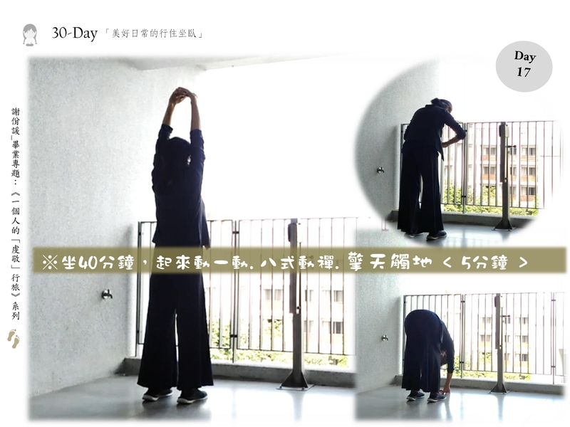 坐40分鐘,起來動一動。八式動禪。擎天觸地 < 5分鐘 >